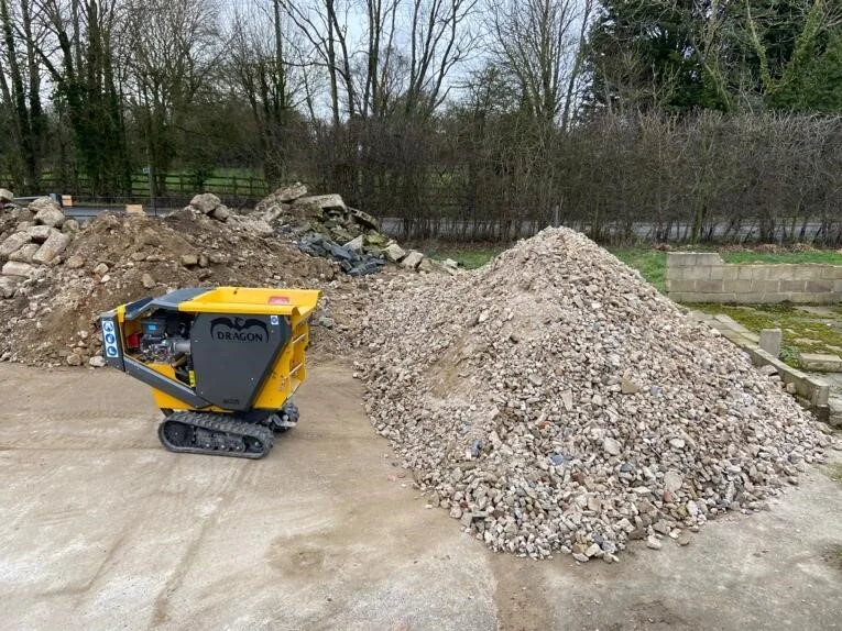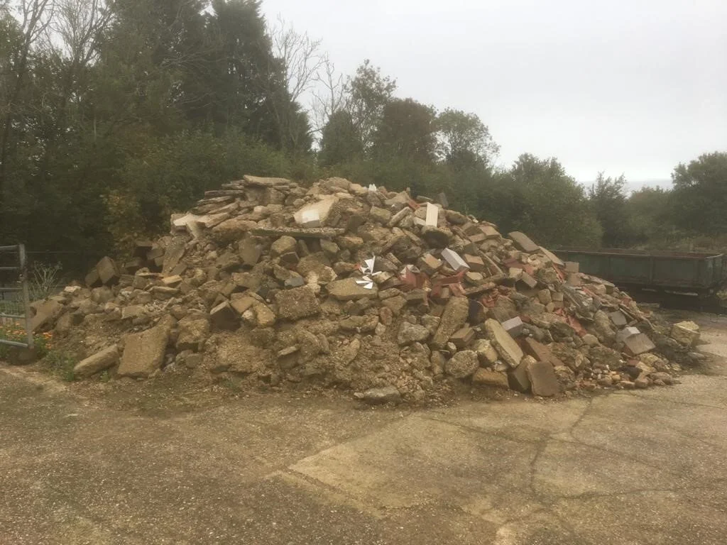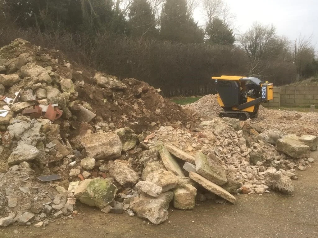 Farm-owner Matt had a mountain of rubble that had built up over some time. He needed to crush it down to use as hard core in various places on the farm. Due to the size and spread of the rubble pile he wanted something that was manoeuvrable around the pile of rubble, rather than having to barrow or carry the rubble to a machine. He also needed a machine that could be hand loaded, as he needed to sort the concrete and bricks from the Thermalite blocks that were mixed in with the rubble, and not suitable to use as hard core.
